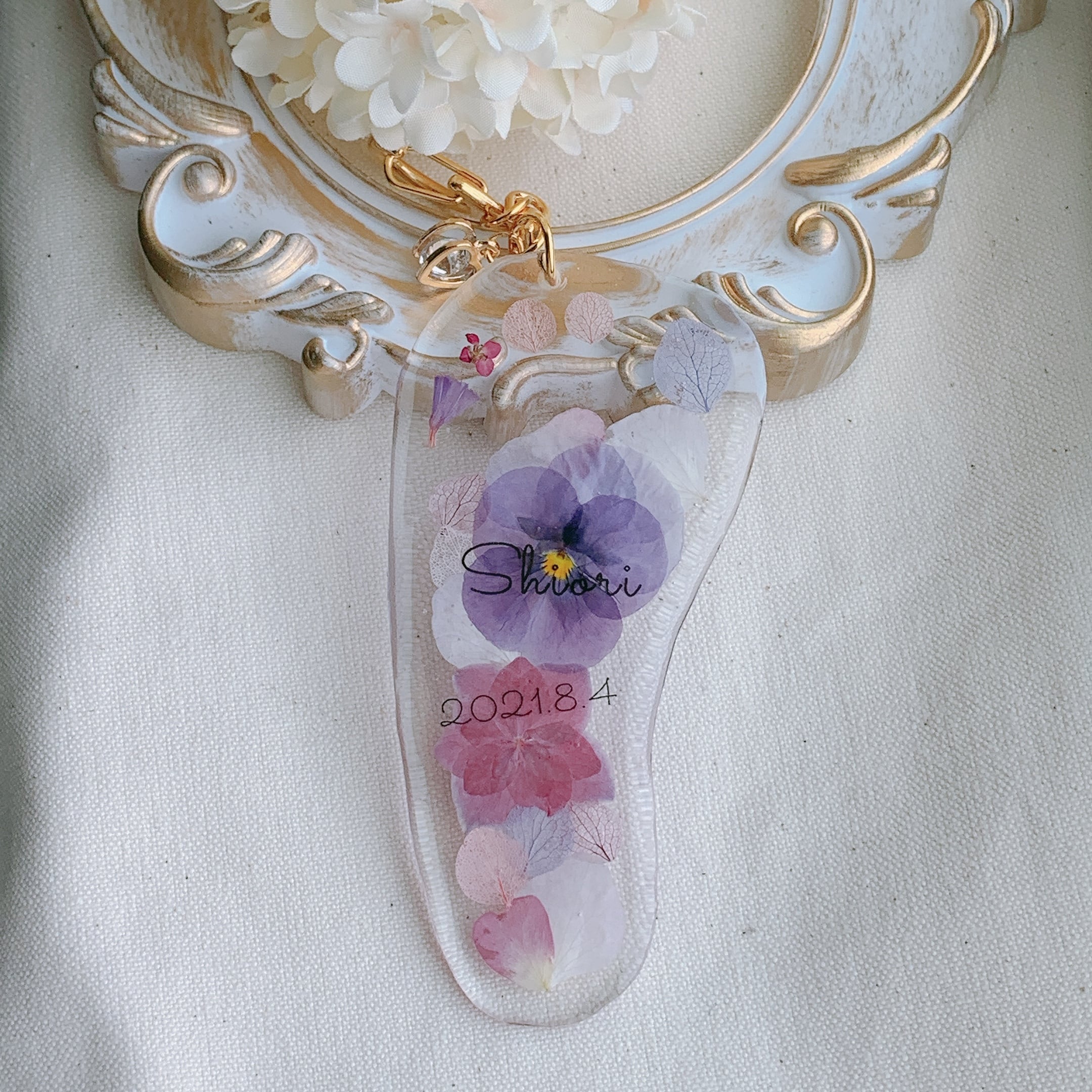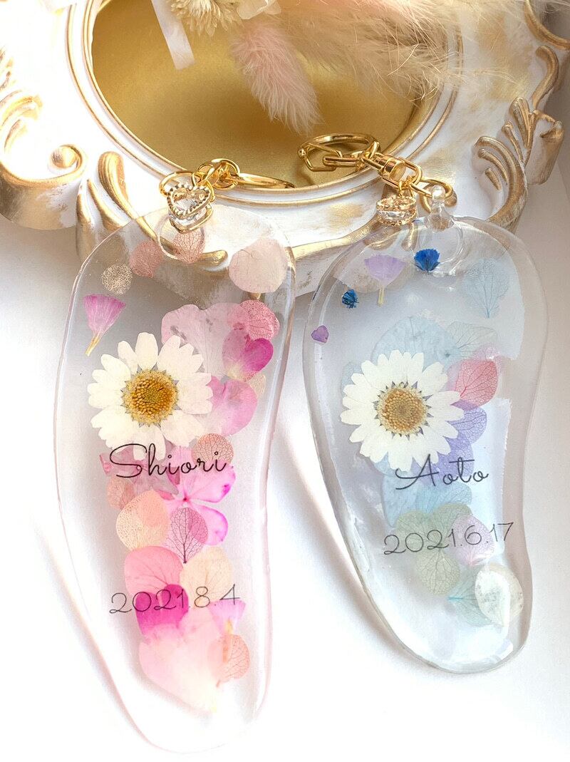 押し花で作るお子さんの足形キーホルダーです。